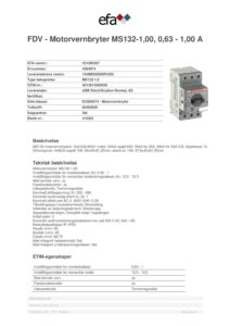 MS132 motorvernbrytere. Ved 230/400V: maks 100kA opptil 20A, 50kA for 25A, 25kA for 32A ICS, trippklasse 10. Dimensjoner: HxBxD=opptil 10A: 90x45x81,25mm, større en 10A: 97,8x45x81,05mm